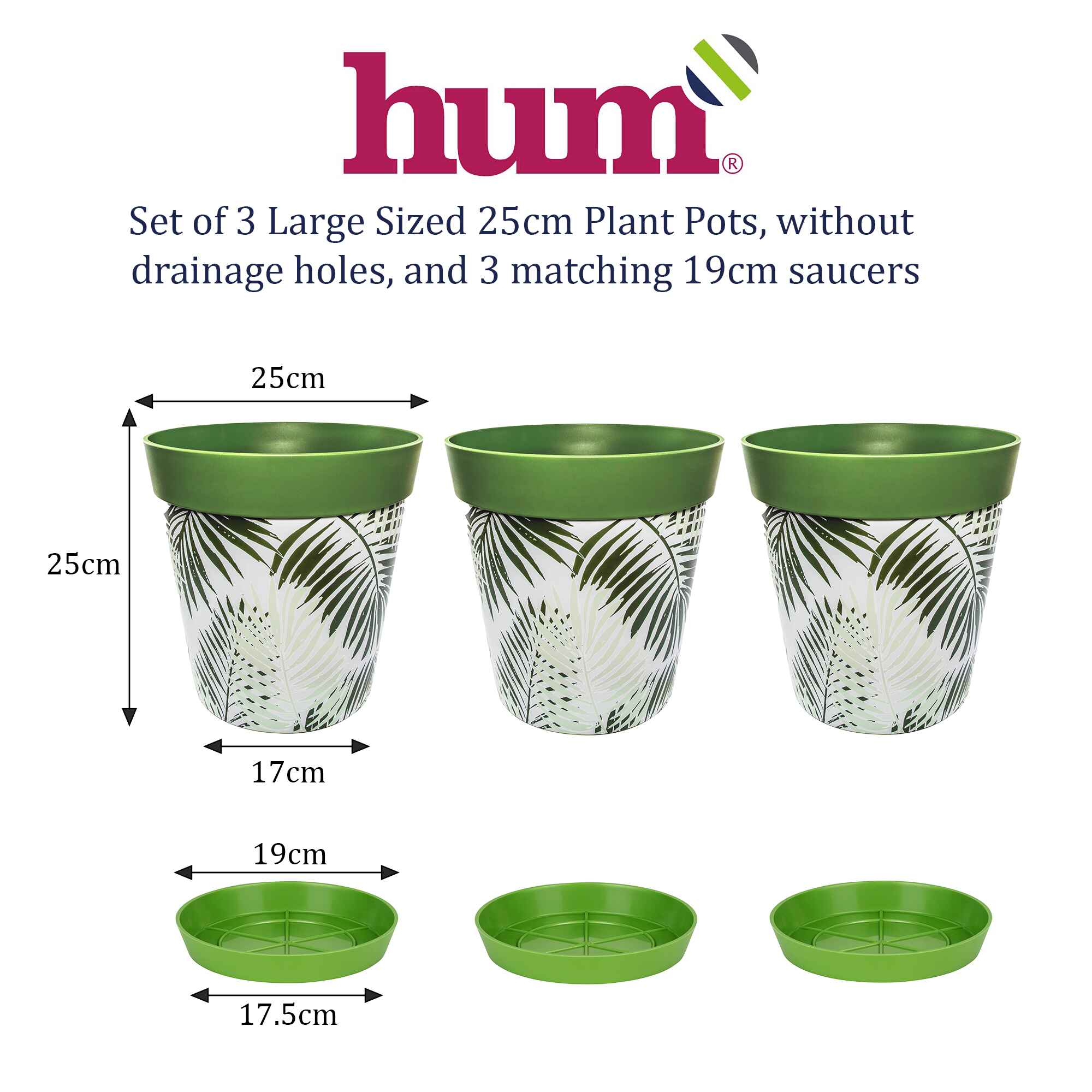 Combination Set of 3 Plastic Green Fern Pattern 25cm Pots with Saucers