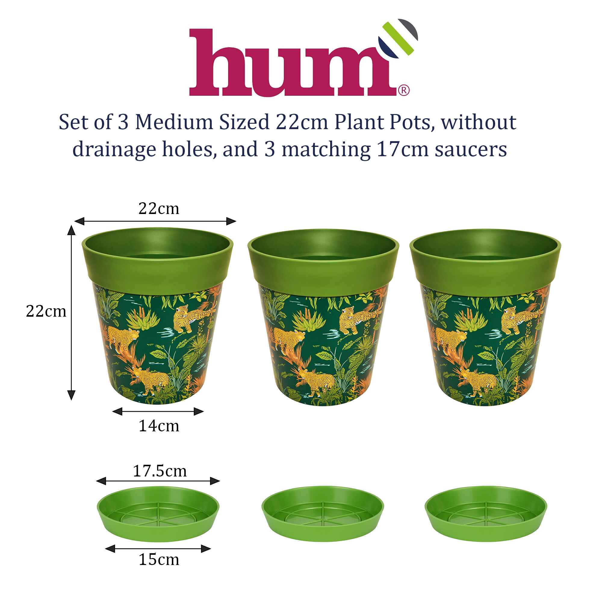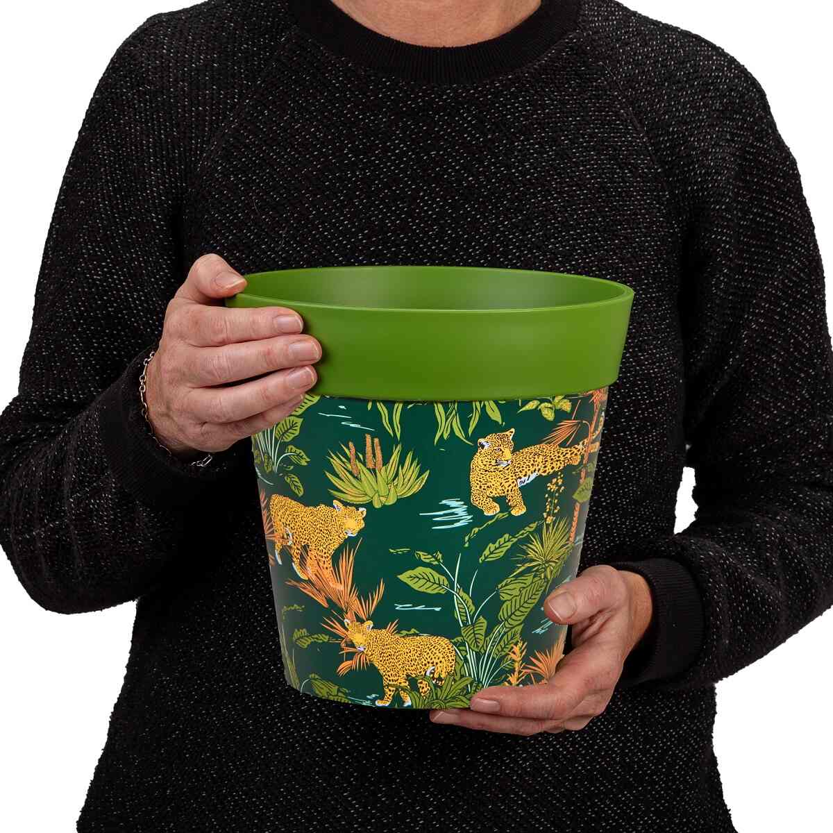 Kombinationsset aus 3 Kunststofftöpfen mit Untertassen, 22 cm, „Dschungel-Leoparden“, grün
