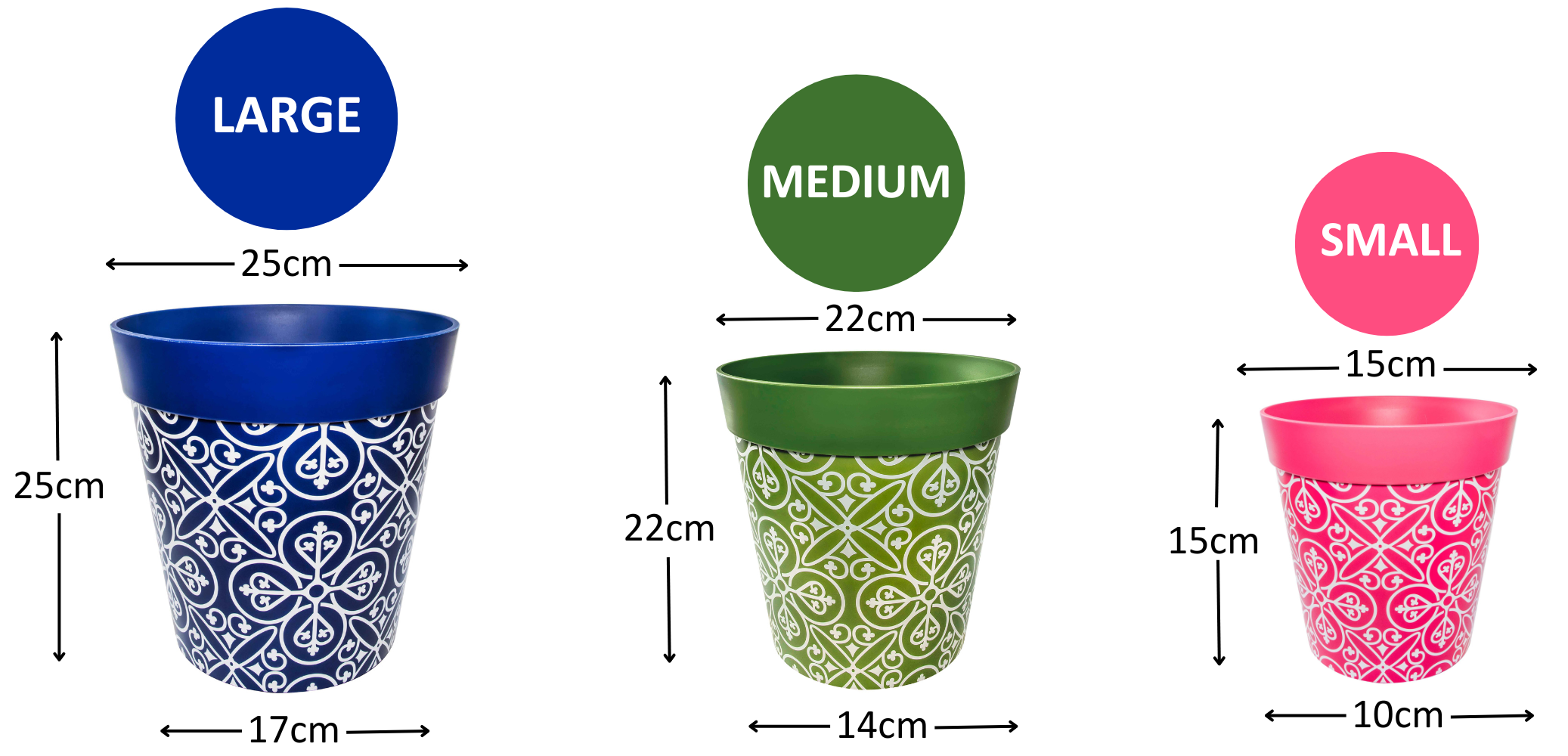 Grand : 25 cm de haut, 25 cm sur le dessus et 17 cm sur la base. À utiliser pour les grandes plantes d'intérieur telles que les Yuccas, les Palmiers et les Ficus, ou les plantes d'extérieur telles que le Bambou et la Cordyline. Achetez la gamme.