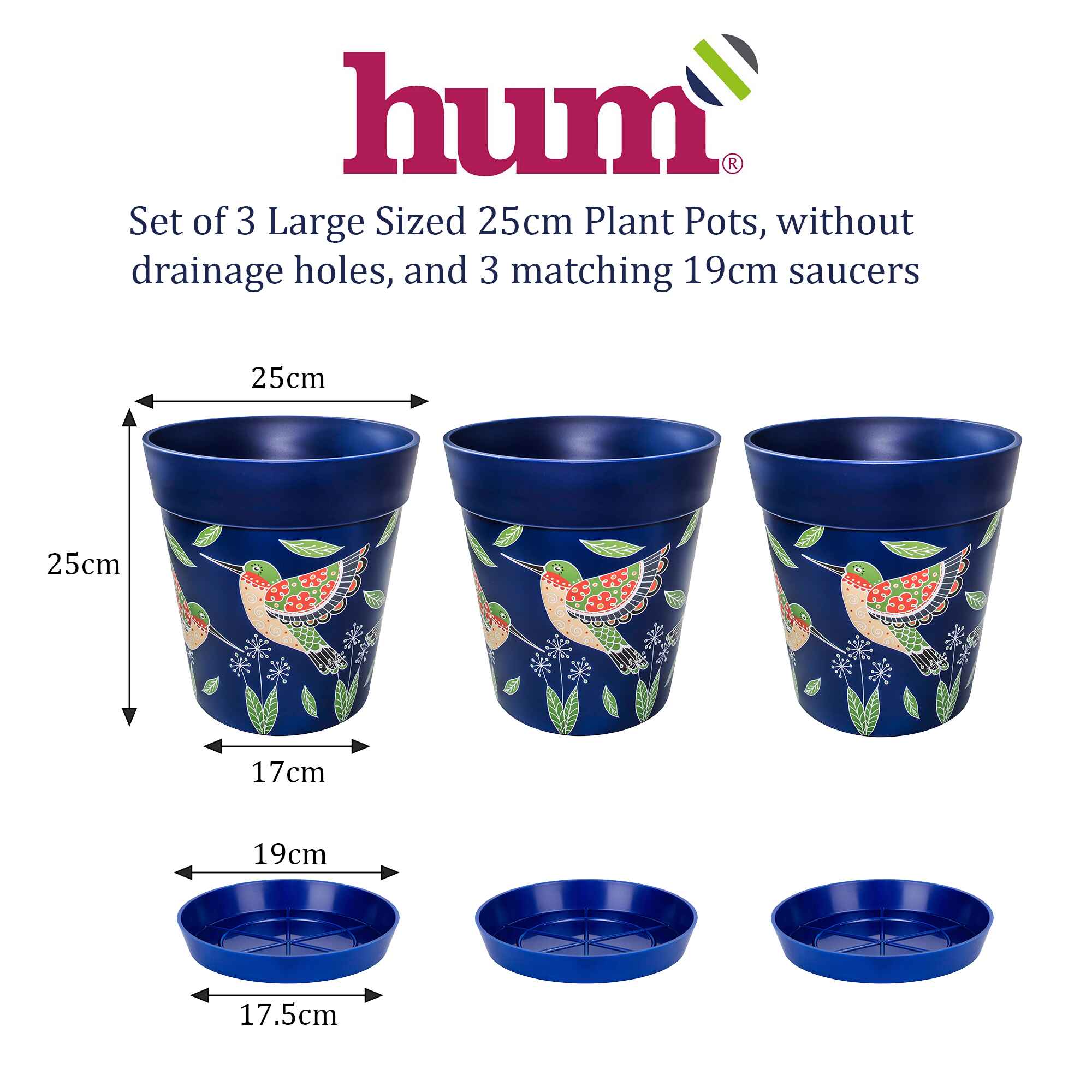 Ensemble combiné de 3 pots colibris bleus en plastique de 25 cm avec soucoupes