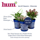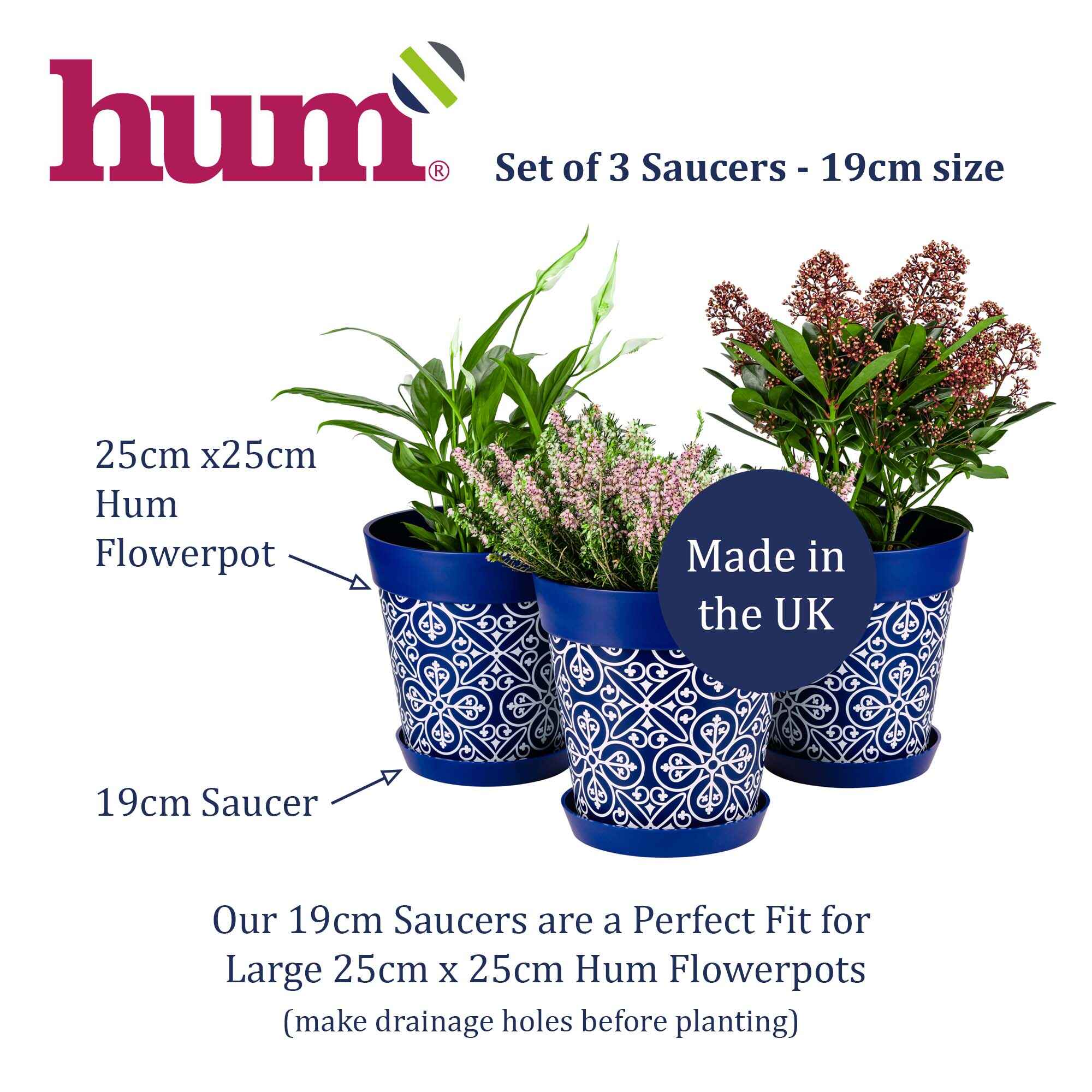 3 PACK OF SAUCERS -19cm (7.5”): Designed to fit Hum Flowerpots 25cm (10”) size. For other pots, please note that the top and bottom saucer dimensions are different. The inner diameter is 17.5cm (6.9”) so please ensure that this is greater than the diameter of the bottom of the pot.