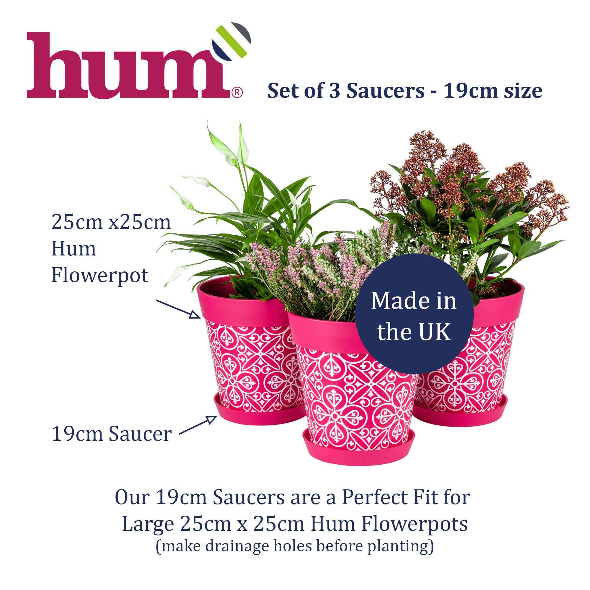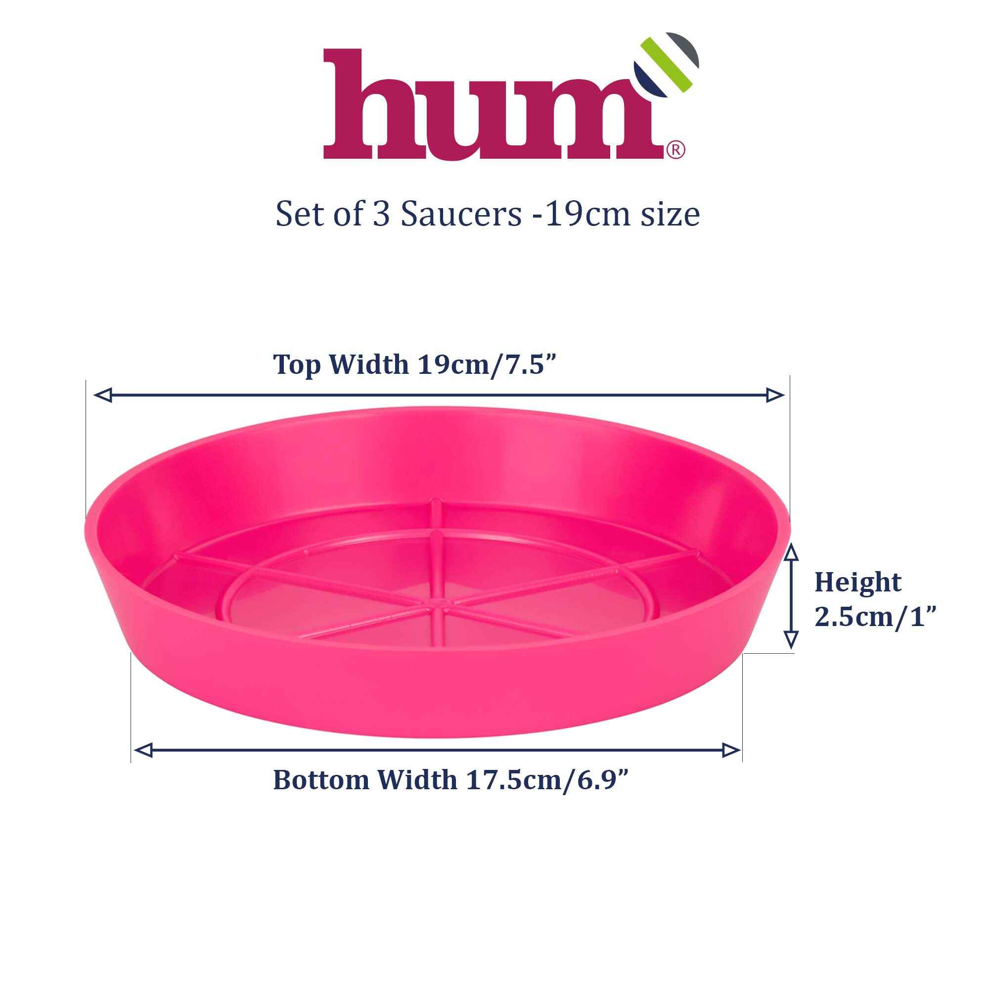 3 PACK OF SAUCERS -19cm (7.5”): Designed to fit Hum Flowerpots 25cm (10”) size. For other pots, please note that the top and bottom saucer dimensions are different. The inner diameter is 17.5cm (6.9”) so please ensure that this is greater than the diameter of the bottom of the pot.